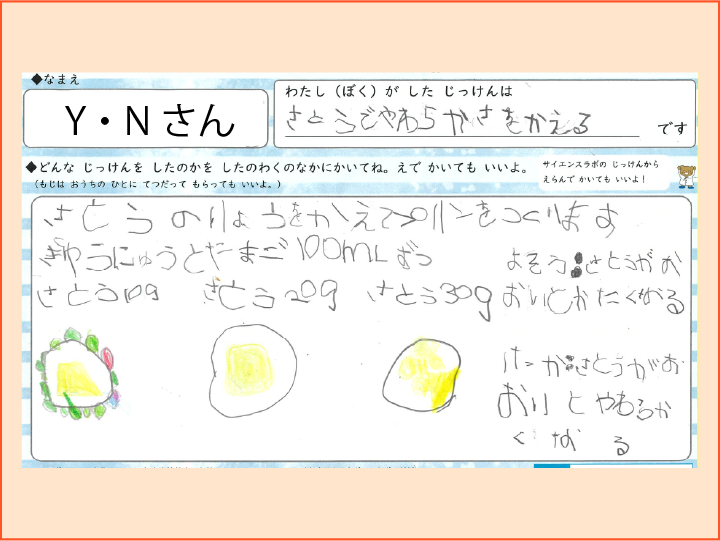 年中・年長の方々は、実験を1枚の用紙にまとめる「ラボレポート」に取り組んでいます。
