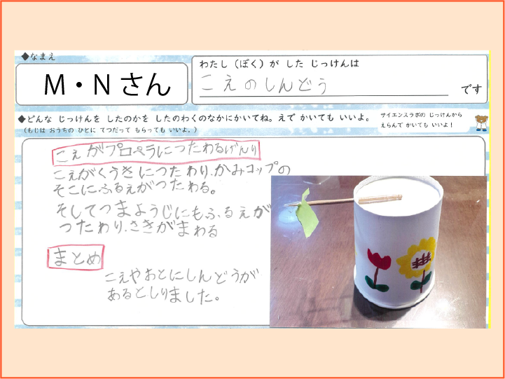 声でコップに付けたプロペラを回すことにチャレンジした実験です。プロペラを回すことに成功し、声や音は振動していることに気づくことができたようです。